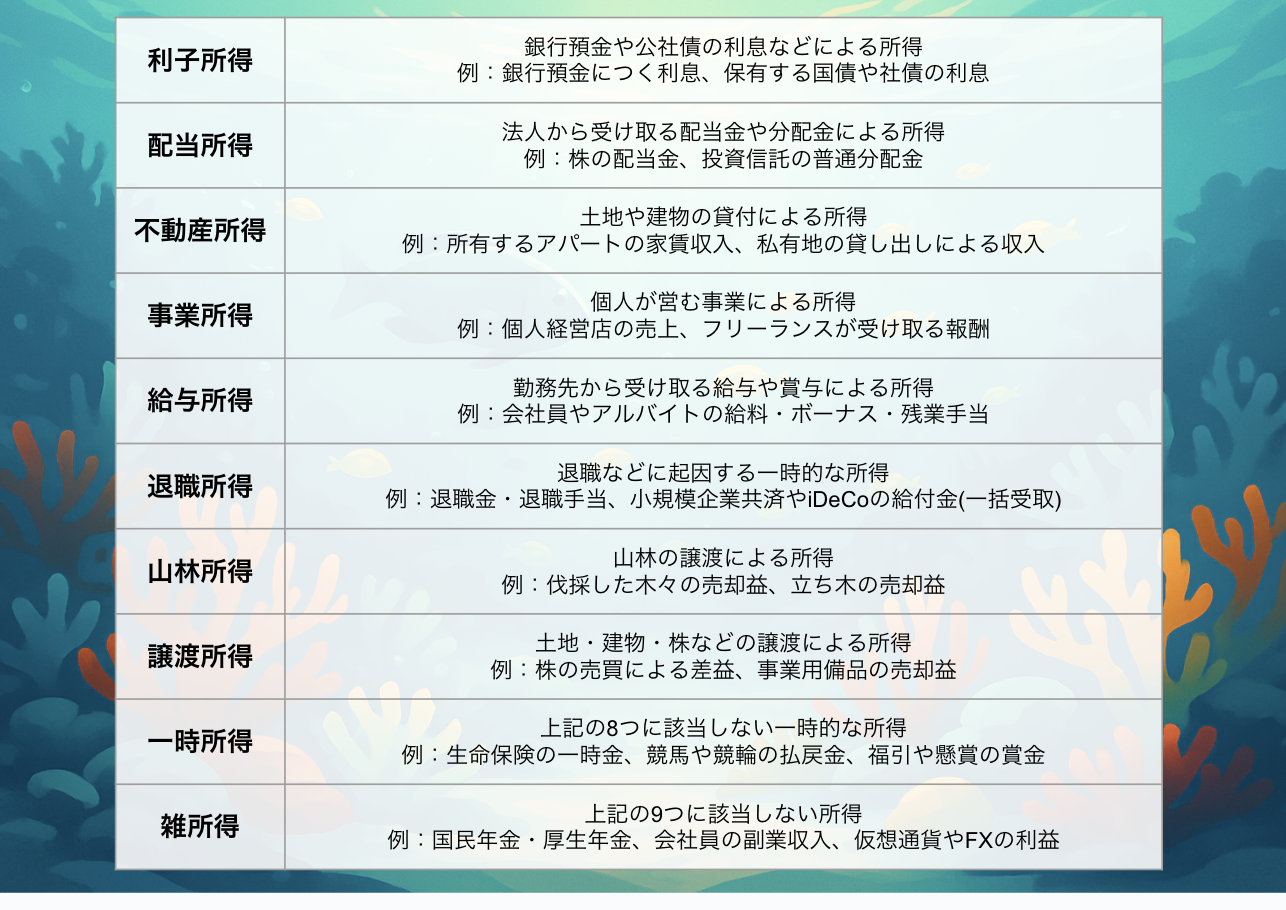 所得は上の画像の通りに大きくは10個に大別することができます。